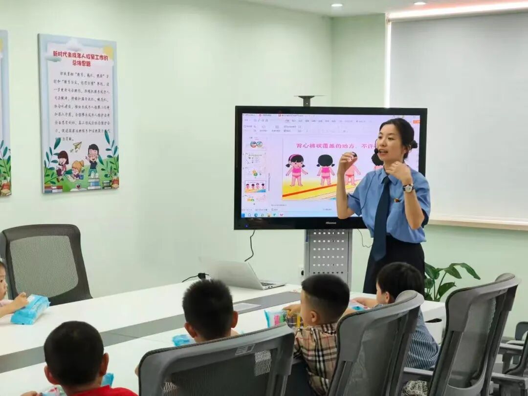 之后,小朋友们走进检察院大厅,检察干警化身为亲切的“法治老师”,用生动有趣、通俗易懂的语言,向小朋友们讲解《未成年人保护法》展板内容,将法律知识编成一个个有趣的小故事,比如“不能随便给陌生人开门”“在学校要和小伙伴友好相处”,小朋友们听得聚精会神,一双双大眼睛里满是求知的渴望。